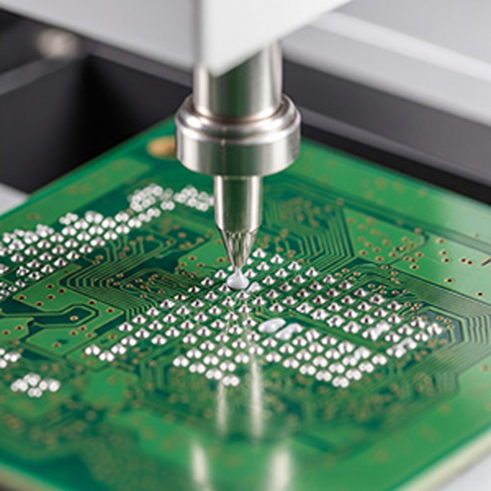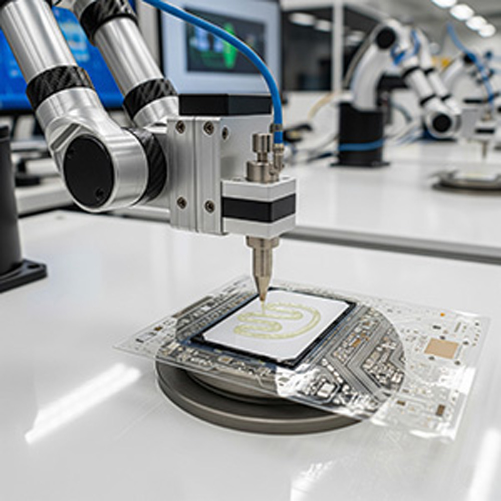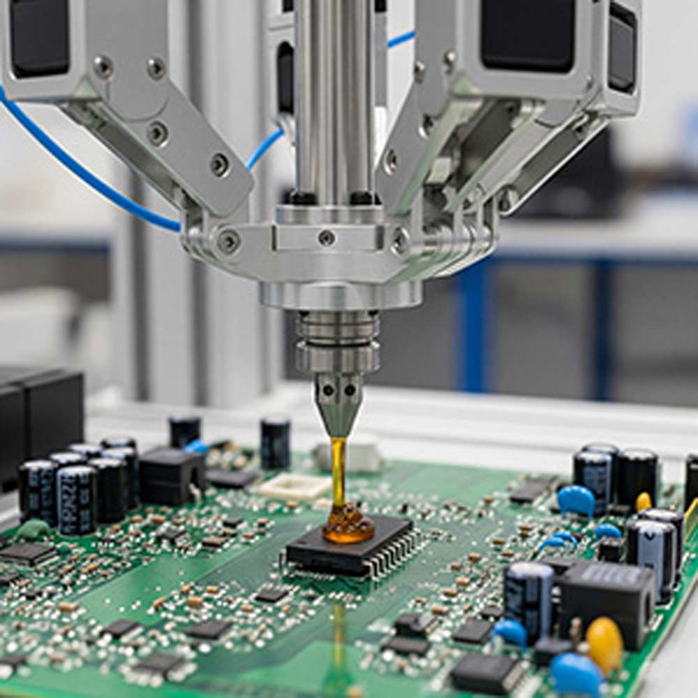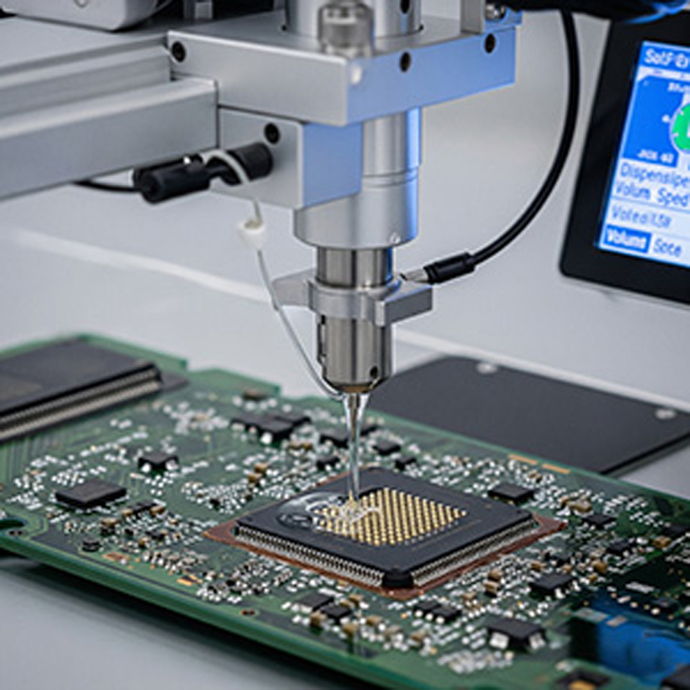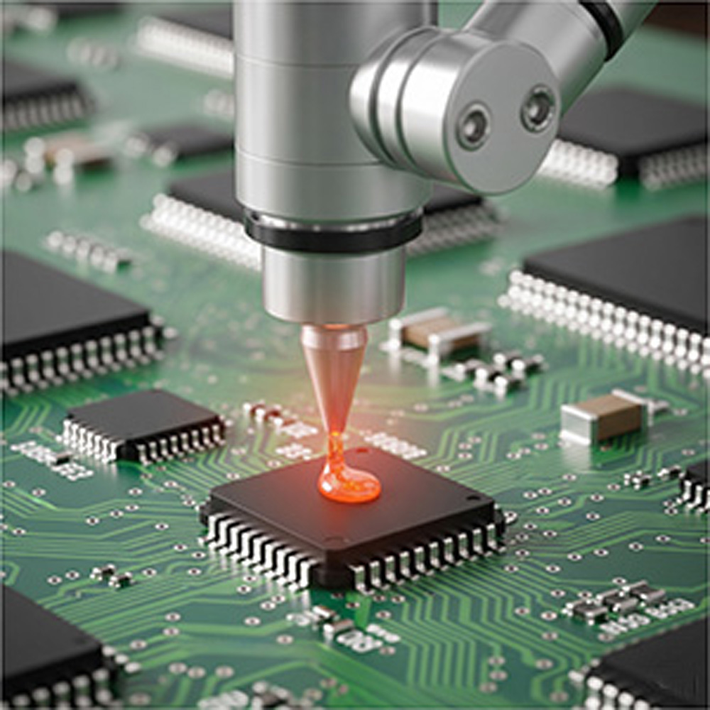 Die gezielte Dosierung von Underfill-Material eignet sich ideal, um Mikrochips und Bauteile auf Leiterplatten mechanisch zu stabilisieren und thermisch zu entlasten. Der Prozess verhindert Risse und Kontaktversagen durch Ausdehnungen und Vibrationen.